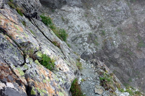 このような岩場を下るとき、必要となれば、既存のハーケンなどを利用しようと、スリングを2本用意していたが、使うようなことはなかった。