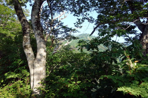3合目からは歩きやすいブナ林の尾根道を登ると、写真で分かるでしょうか、樹間からずっとずっと上に空と同じ色の山頂が見えた。