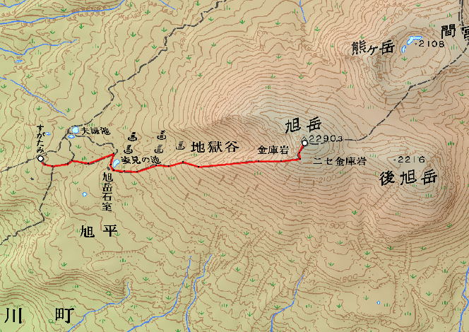 姿見駅登山口9:10 → 大雪山旭岳11:06〜10 → 姿見の池12:06(大休止) →