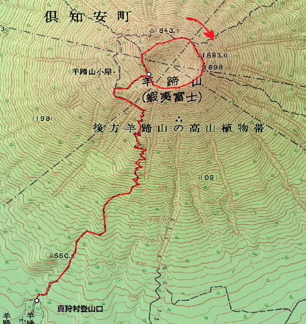 真狩登山口4:20 → 火口8:01 → 後方羊蹄山8:45〜9:00 → 火口9:41 →