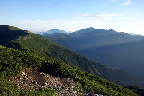 視点を変え、今度は、今日の幕営地である熊ノ平小屋方面を見る。まだまだ遠い。